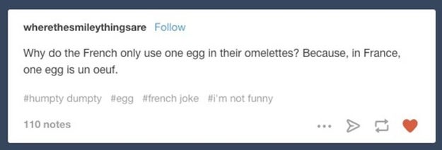 Did you hear about the frenchman who jumped into the river in paris? A joke that would be considered offensive in your country may be completely normal in france. Jokes in french are also a door into french culture. This joke that's so bad it's good shenanigism.tumblr.com 4. One of them is run over and the other one says oh purée !)